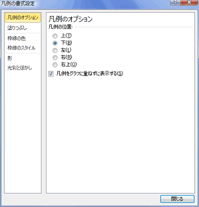 - 凡例の書式設定のダイアログボックスが表示されますので、このダイアログボックスで書式が変更できます。