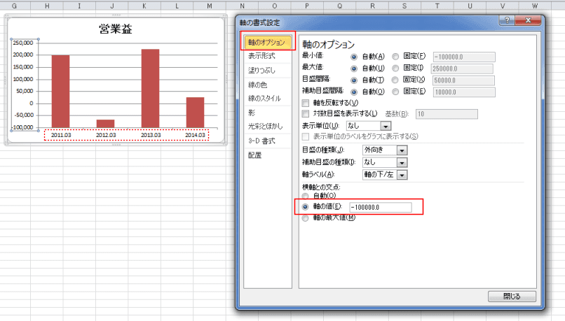 [軸のオプション]を選択して、横軸との交点の「軸の値」にチェックを入れて、「-100000」と入力しました。