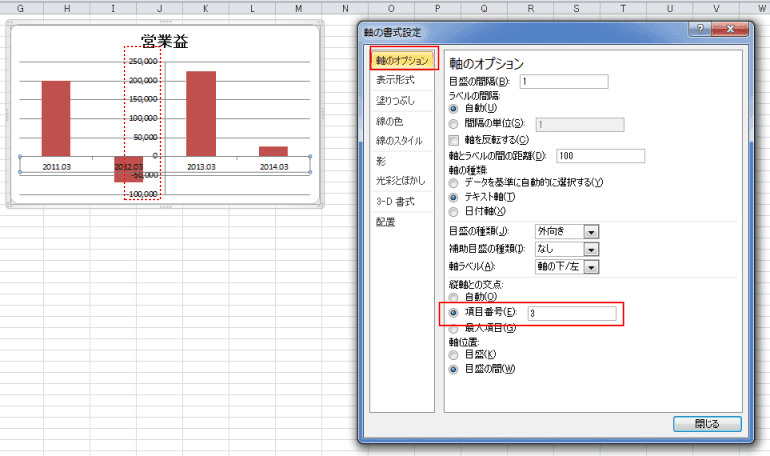 [軸のオプション]を選択して、縦軸との交点の「項目番号」にチェックを入れて、「3」と入力しました。