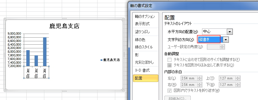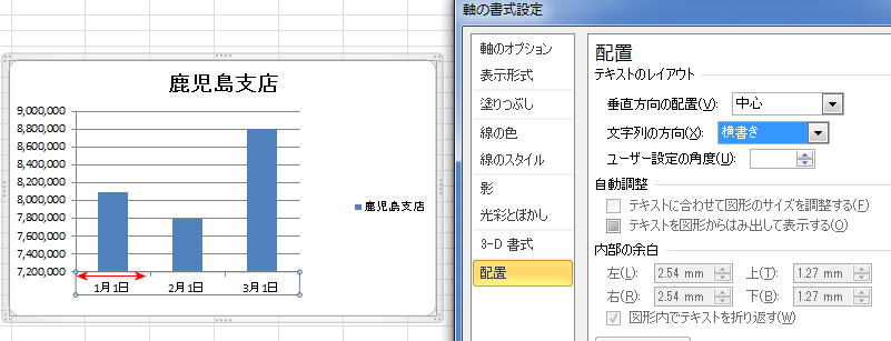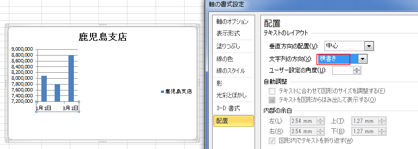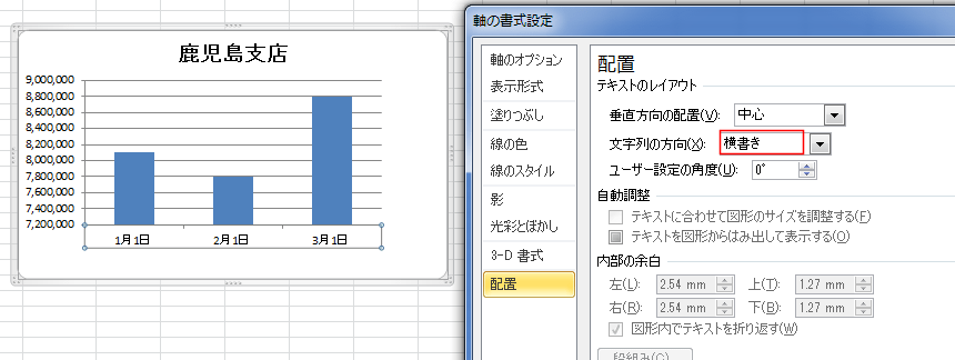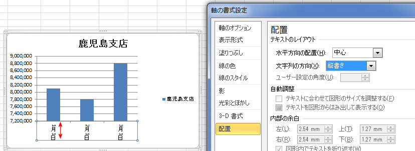 - 軸の書式設定で配置の設定は表示できる領域に応じてExcelが自動調整しますので、表示する領域を確保して設定を行う必要があります。