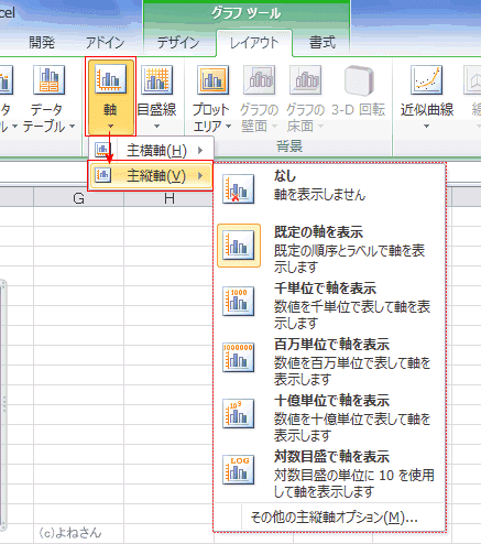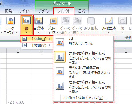 - グラフツール リボンのレイアウトタブの[軸]グループにある[軸]をクリックします。