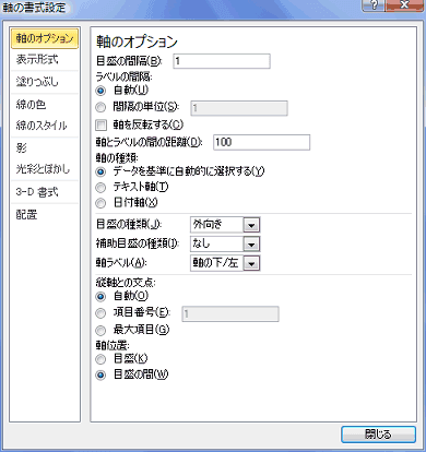 - 選択している軸の書式設定のダイアログボックスが表示されますので、このダイアログボックスで書式が変更できます。