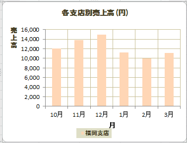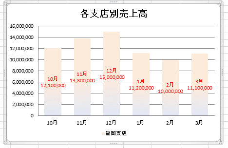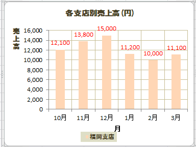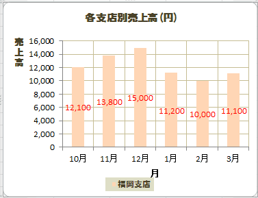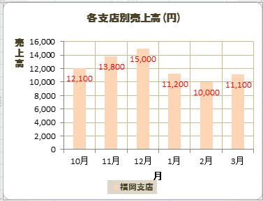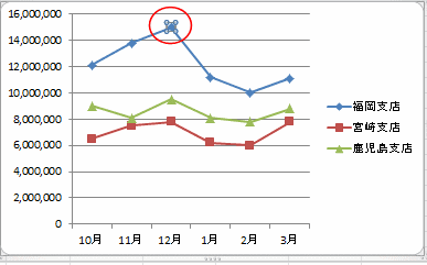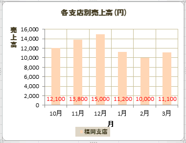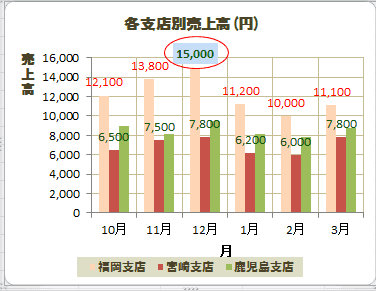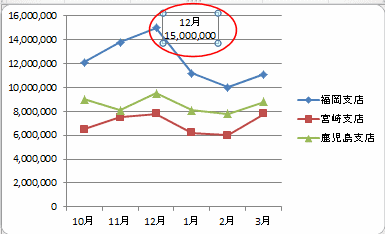 下図は系列「福岡支店」の要素「12月」のデータラベルを選択しています。