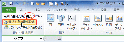 そして、グラフツール リボンのレイアウトタブの[現在の選択範囲]グループにある[選択対象の書式設定]を実行します。