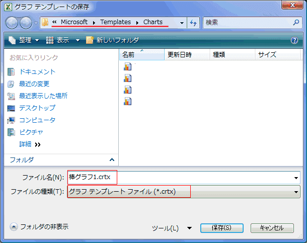 - フォルダの場所:Windows VistaではC:\Users\ユーザー名\AppData\Roaming\Microsoft\Templates\Chartsとなります。