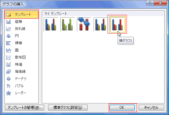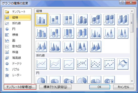 - [グラフの挿入]ダイアログで「テンプレートの管理」を実行します。