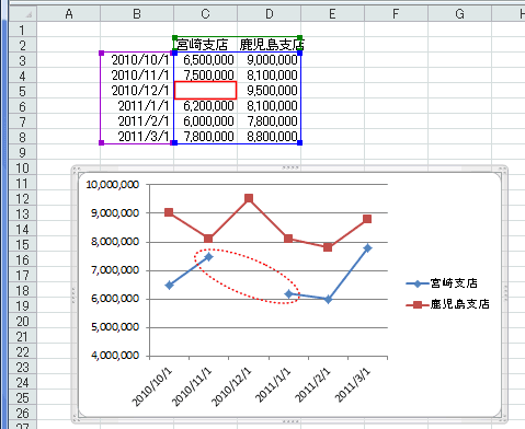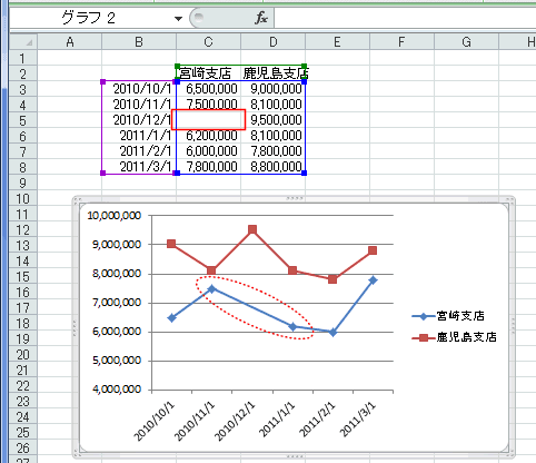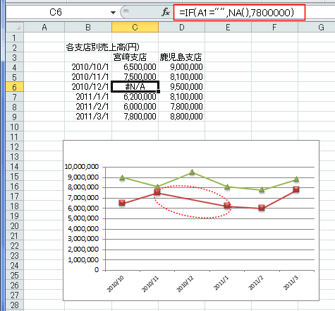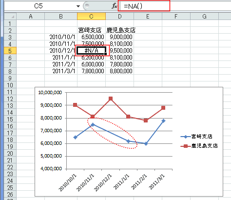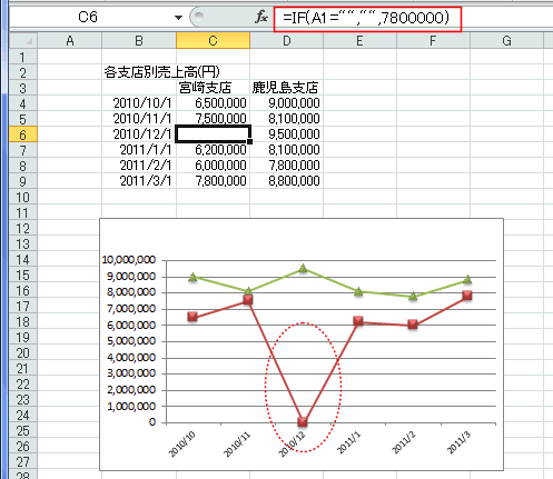 | 途切れた折れ線をつなぐ | 「""」(長さ 0 の文字列) がセルに入力されていた場合の対処法 | |