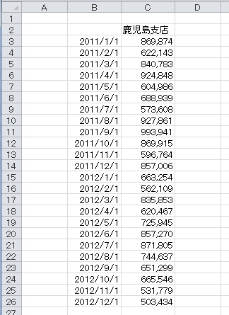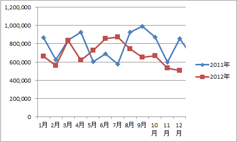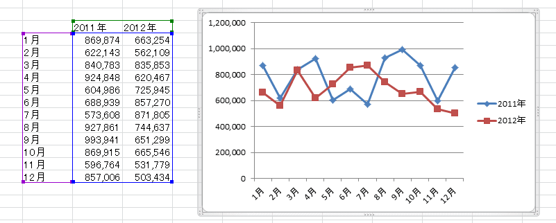 よねさんのExcelとWordの使い方|エクセル2010基本講座:目次|グラフの使い方|複数年のデータを月単位の折れ線グラフにしたい