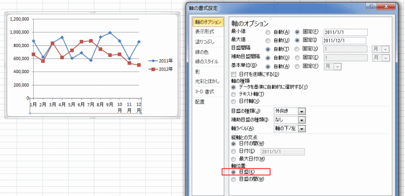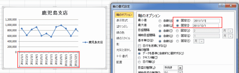 軸のオプションで最小値を「固定」「2011/1/1」、最大値を「固定」「2011/12/1」とします。