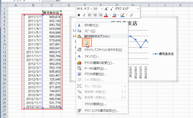 グラフエリアを右クリックして、[貼り付け]を実行します。