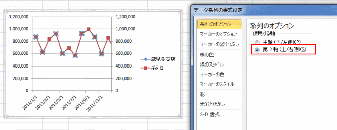 - 「系列2」をダブルクリックして、データ系列の書式設定を表示します。