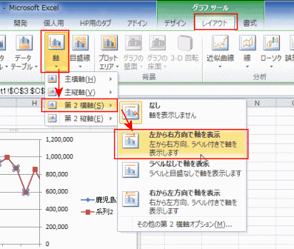 [軸]→[第2横軸]→「左から右方向で軸を表示」を選択します。