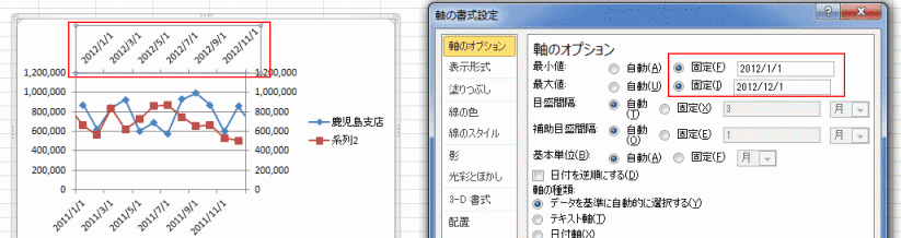 軸のオプションで最小値を「固定」「2012/1/1」、最大値を「固定」「2012/12/1」とします。
