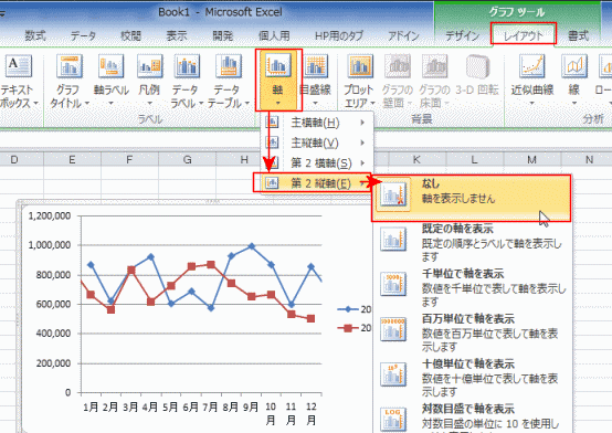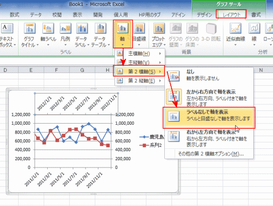 [軸]→[第2横軸]→「ラベルなしで軸を表示」を選択します。