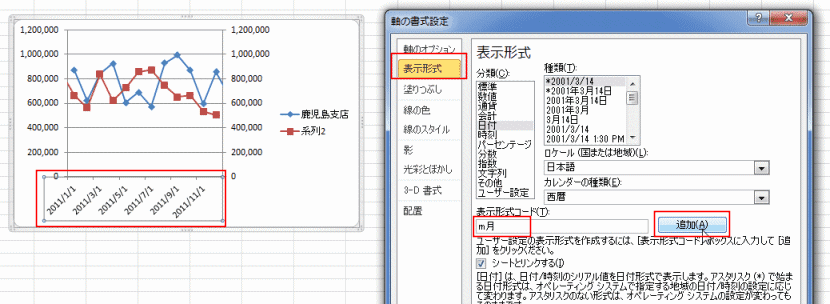 [表示形式]を選択して、表示形式コードに「m月」と入力します。[追加]ボタンをクリックします。