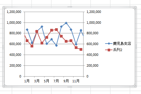 - 「系列2」がグラフに表示されました。同じデータを使っているので2つの系列が重なって表示されています。