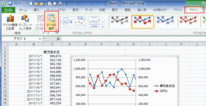 グラフツールの[デザイン]タブを選択して、[データの選択]を実行します。