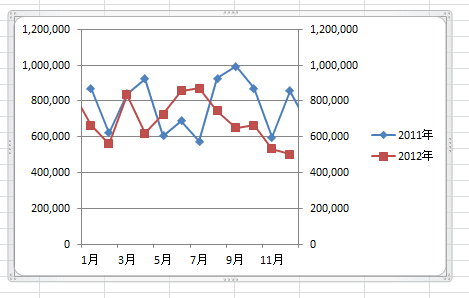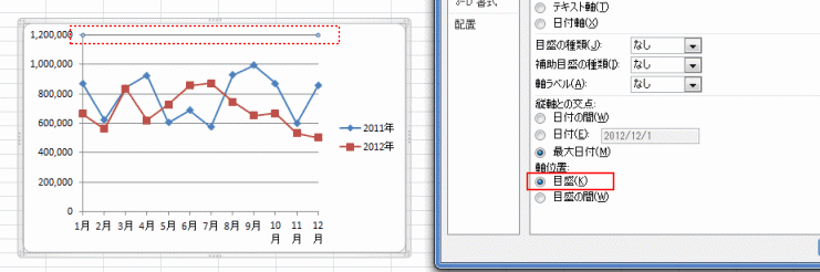 - X軸の目盛範囲を2011/1〜2011/12に変更します。