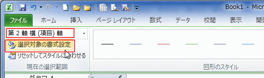 グラフ要素のドロップダウンリストで「第2横(項目)軸」を選択して、[選択対象に書式設定]をクリックします。