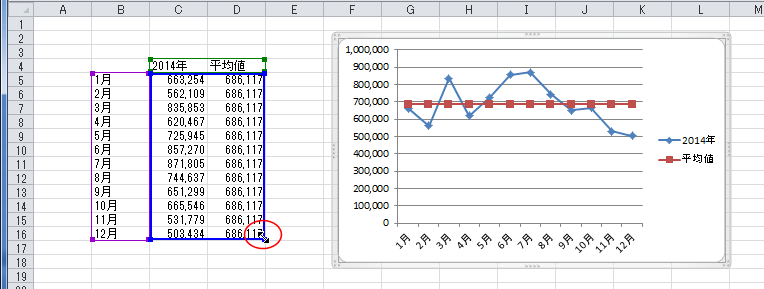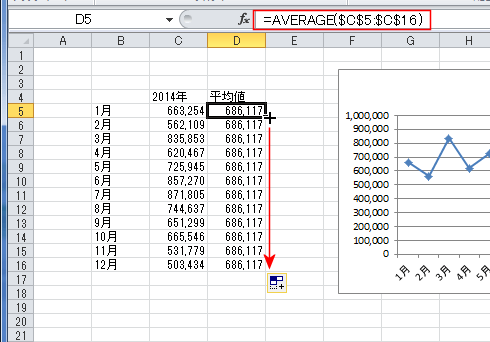 - D5セルに 平均値を求める数式 =AVERAGE($C$5:$C$16) を入力して、フィルハンドルをドラッグ、または ダブルクリックして、D16セルまでコピーします。