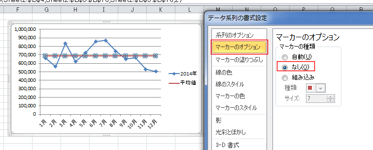 [マーカーのオプション]を選択して、マーカーの種類を「なし」にします。