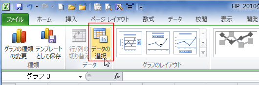 - グラフを選択して、グラフツールのデザインタブの[データの選択]を実行します。