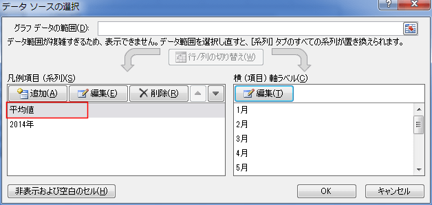 - 凡例の平均値が不要なら、「平均値」を2回クリックして選択します。[Delete]キーを押すと、凡例から「平均値」を削除することができます。