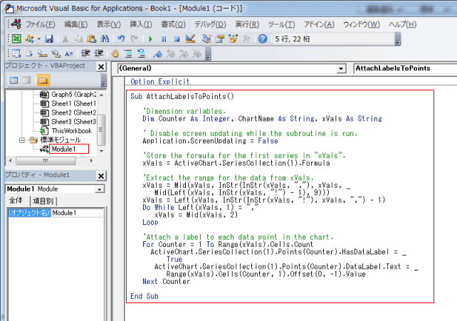 | Sub test() Dim i As Integer Dim D_Label As Variant 'ラベルに使うセル範囲を指定します。 D_Label = Sheets("Sheet1").Range("B2:B9").Value With ActiveChart.SeriesCollection(1) .ApplyDataLabels For i = 1 To .Points.Count .Points(i).DataLabel.Text = D_Label(i, 1) Next i End With End Sub |