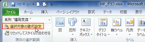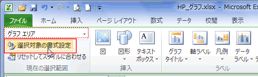 - または、グラフツールの[書式]タブまたは[レイアウト]タブでグラフエリアを選択して[選択対象の書式設定]でダイアログを開きます。