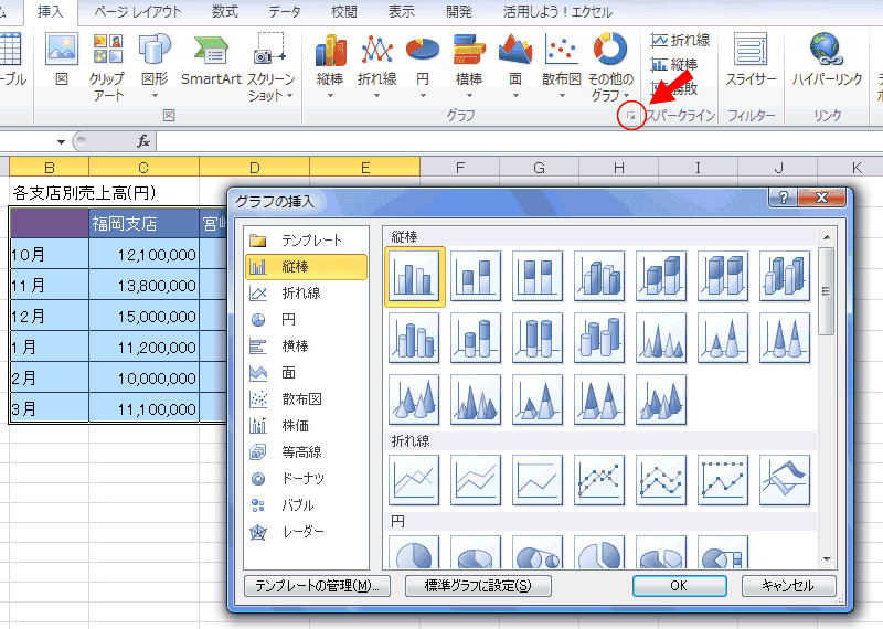 「グラフの挿入」ダイアログが表示されますので、[縦棒]の[集合縦棒]を選択し[OK]ボタンをクリックします。