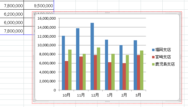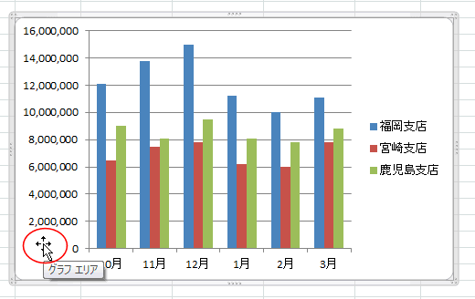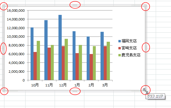 - グラフを選択すると表示される外枠の8か所にハンドルがあります。