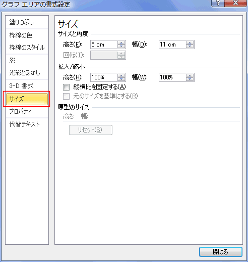 - グラフエリアの書式設定ダイアログでは数値でサイズを指定することができます。