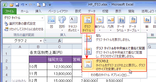 - グラフツール リボンの[レイアウト]タブの[グラフタイトル]→[グラフの上]を実行しました。