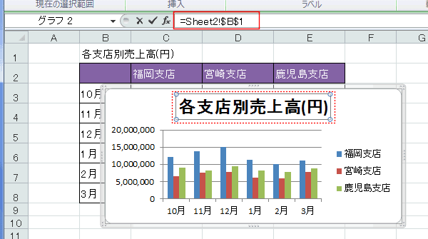 また、セルを参照することもできます。下図はSheet2のB1セルを参照し、B1セルの値をグラフタイトルに表示しています。