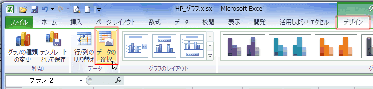 - グラフを選択して、[デザイン]タブの[データの選択]を実行します。