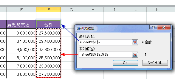 - 系列名にSheet2のf2セルを、系列値にSheet2のF3:F8を指定しました。