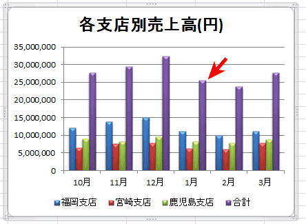 - 合計のグラフを折れ線グラフにしたいと思いますが、以降の操作は複合グラフの作成を参照してください。