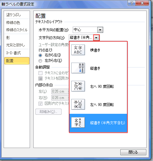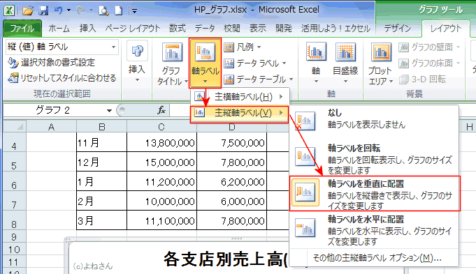 - Excel2003以前では軸に平行に配置され、書式設定で修正しましたが、Excel2007以降では一度で処理するコマンドができました。