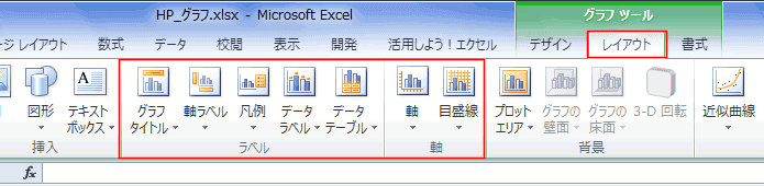 - ラベルなどを追加、修正したいときはグラフツール リボンの[レイアウト]タブにラベルや軸に関するコマンドが準備されていますので、ここから設定を変更/修正することができます。