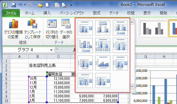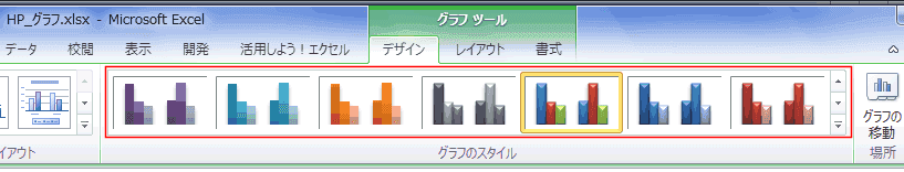 [デザイン]タブの「グラフのスタイル」から選択することができます。
