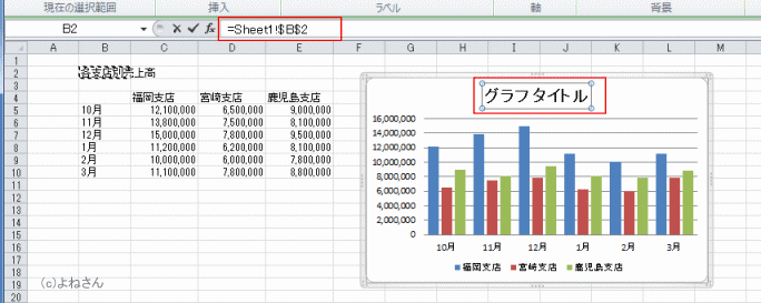 グラフタイトルを選択して数式バーにカーソルを表示します。参照するセル「B2」をクリックすると、数式バーに「=Sheet1!$B$2」と入力されました。[Enter]キーを押して確定します。