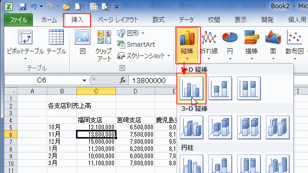 - [挿入]タブのグラフグループにある[縦棒]→[2-D縦棒の集合縦棒]を実行します。