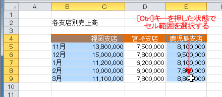 グラフにしたいデータが飛び飛びの列になっているときは、離れたデータ範囲を[Ctrl]キーを押した状態で選択します。