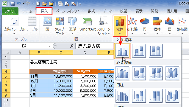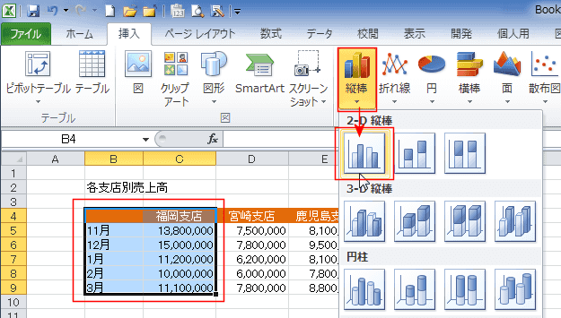 下図ではB4:C9セルを選択して、[縦棒]→[2-D縦棒の集合縦棒]を実行します。