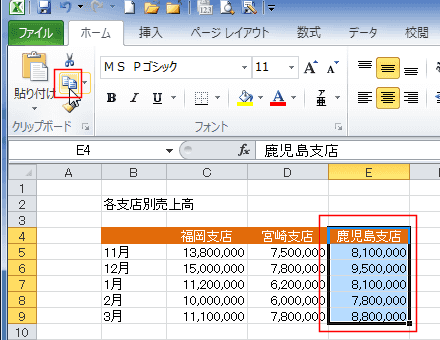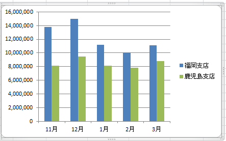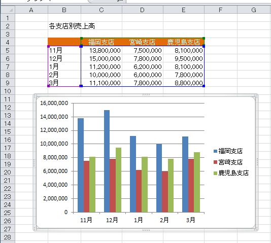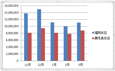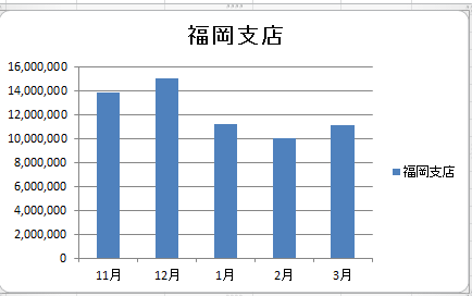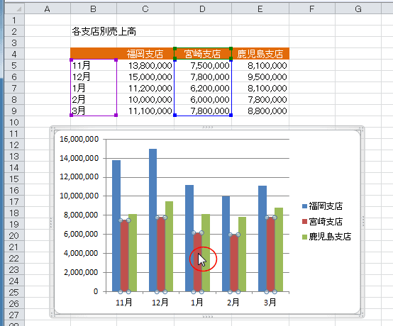 ここの例では系列「宮崎支店」を選択して、[Delete]キーを押します。