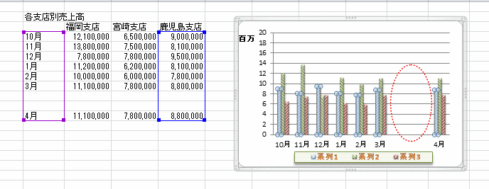 - グラフのもとになる表が下図のように離れているケースでは、グラフの範囲を広げると・・・