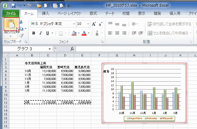 - グラフエリアを選択して、[ホーム]タブの[貼り付け]を実行します。または、[Ctrl]+[V]で貼り付けます。