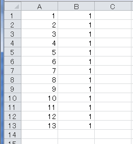 ここでは13枚の図(画像)を使用しますので、A列に1〜13と入力します。