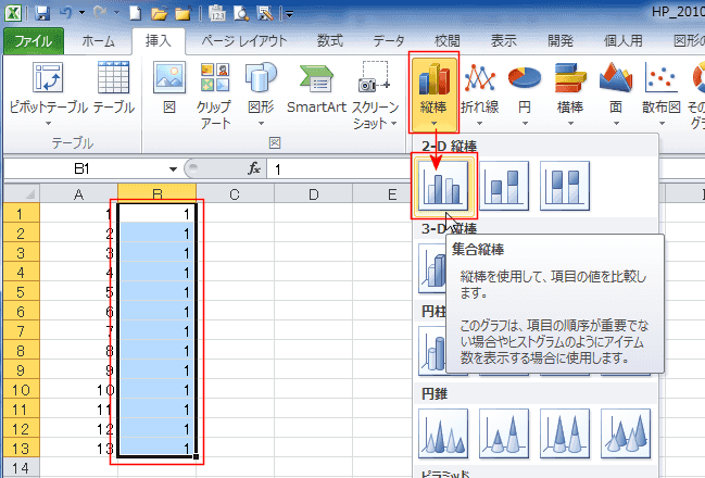 [挿入]タブの[縦棒]→[集合縦棒]を選択します。