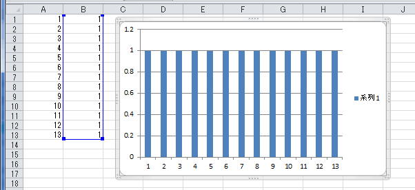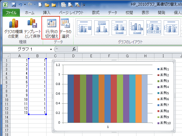 [行/列の切り替え]ボタンをクリックして、系列1〜13のグラフに変更します。